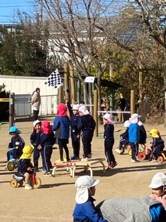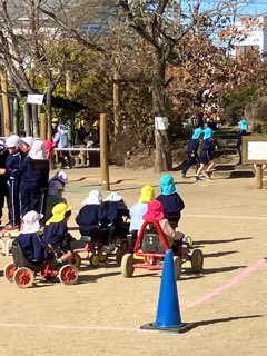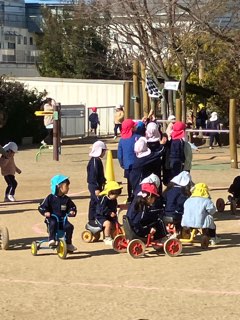 園庭がにぎやかです。いつもはSuku-sukuの森で乗っている3輪車が、園庭の中央に集められています。