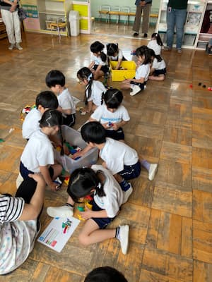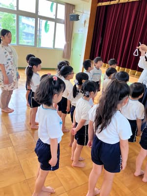 オーガンジーをくぐったり  トライアングルの音を聴き 音がしなくなったら 座るもしくは立つ
