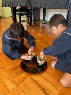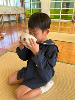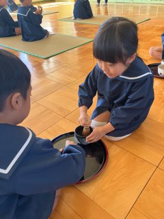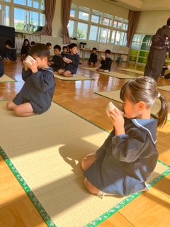 今日は年長組さんのお茶会です。制服に身を包み、いつもと違う雰囲気の子どもたちです