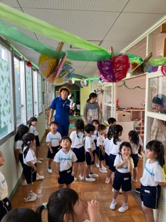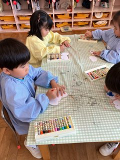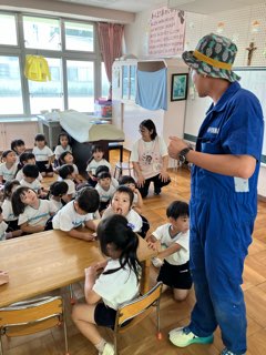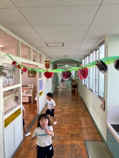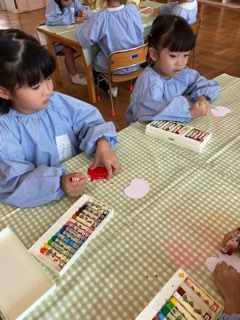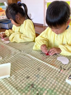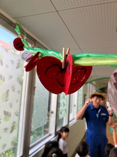年少組さんへ、リンゴのお届け物です。あれ?急いで持ってきたから、色が落ちちゃった!