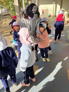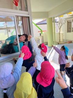 「こわい~っ」「だいじょうぶ、だいじょうぶ」先生が励ましてくれます。