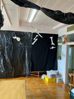 どうやら、園長先生が拾った怪しげなスティックをふりまわしたせいで、子どもたちがおばけに変身してしまった、という設定でお化け屋敷を行うようです